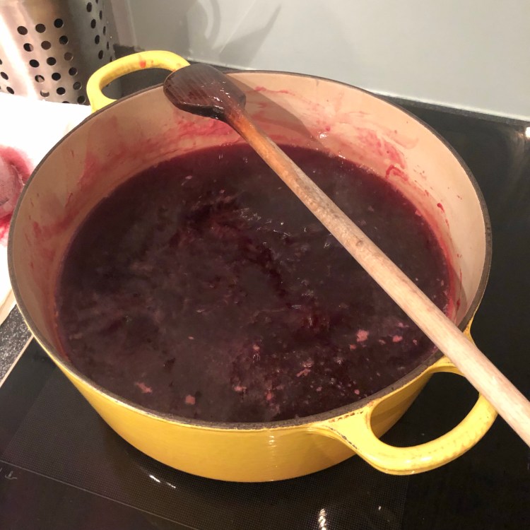 De volgende fase van de ziekte manifesteert zich wanneer je op een namiddag – meestal in het weekend – nonchalant naar de tuin wandelt om een keertje te bekijken hoe ver dat emmertje dat je “per ongeluk” hebt meegenomen, gevuld zou raken. Om vervolgens twee uur later in de keuken jezelf te verwensen omdat die wasbak toch écht niet tot aan de rand toe vol moest. Maar ja, gedane zaken nemen geen keer dus de besjes krijgen een badje, de onrijpe besjes, blaadjes en beestjes worden er tussenuit gevist en al wat goedgekeurd is voor de dienst gaat de ontsapper in. Dat dat ook geen bezigheid is van een minuut of tien, lijkt me redelijk duidelijk, vandaar dat de ZZAZ haar hoogtepunt pas tijdens de avonduren kent. Van zodra het avondeten en de afwas achter de rug zijn, kan er dus gelei gemaakt worden. “Effe snel” is ook hier niet aan de orde, al gebiedt de eerlijkheid me om toe te geven dat ik dat gelei maken tot een zo goed als heilig proces van vaste waarden heb verheven. Al een geluk dat er – ook dit jaar – in juni nooit wat op TV is 😉