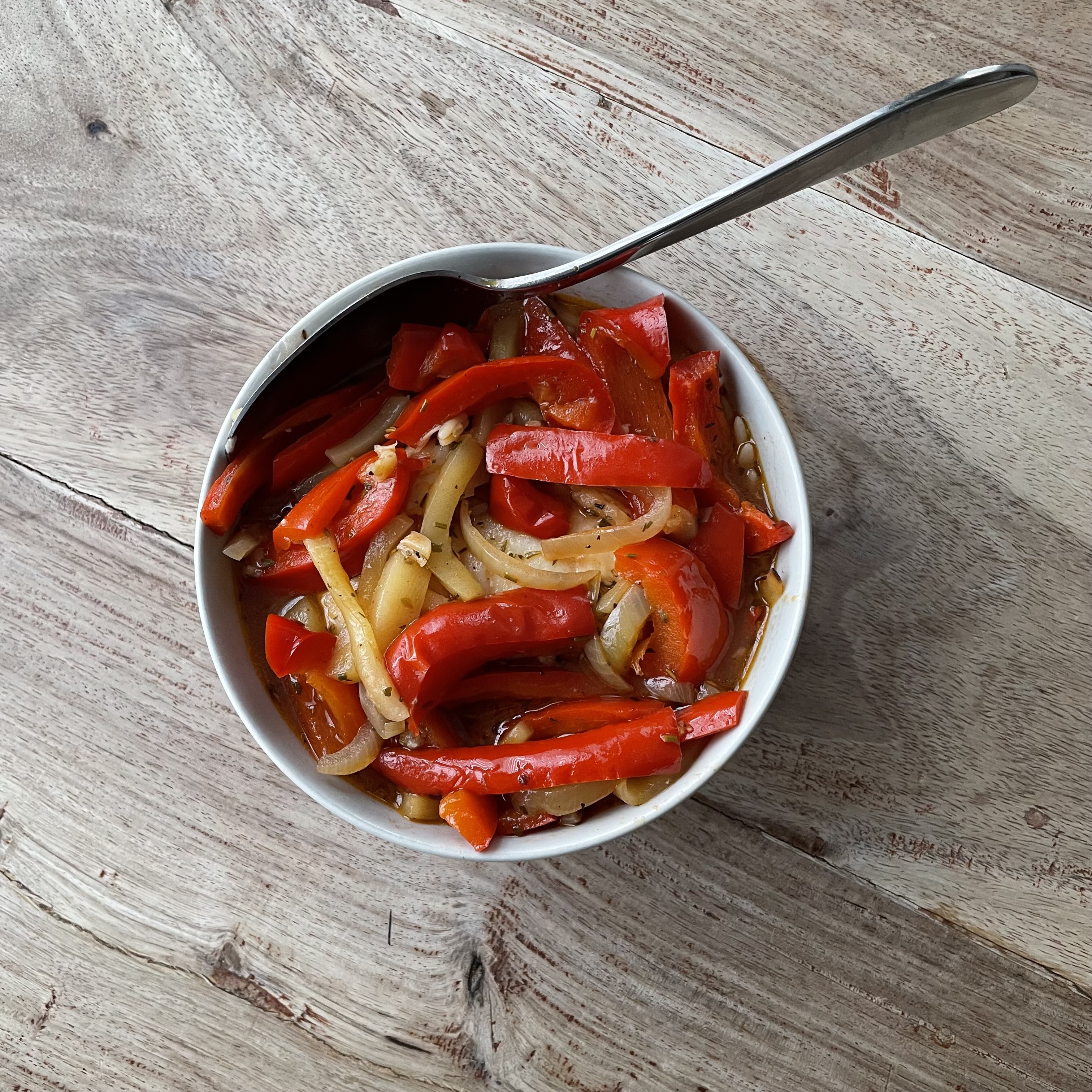 Snij de ui in halve ringen. Snijd de paprika in niet al te brede reepjes en snijd ze nog eens in de andere richting in de helft.